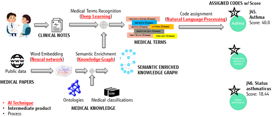 - recognition and assignment: involving a medical terms‘ recognition process using Deep Learning, followed by the definition of weighted score-ranking formulas to calculate the potential encoding of input clinical notes.
