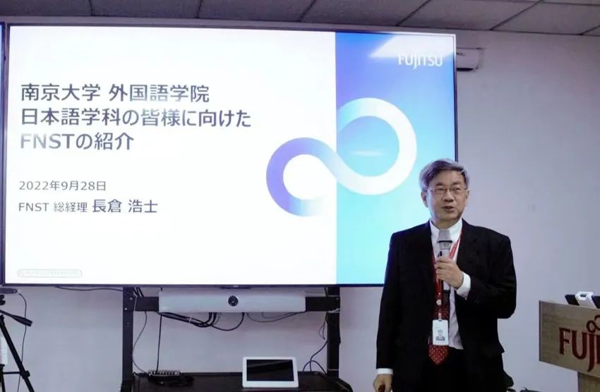 交流活动正式开始后,长仓总经理首先对南大外院师生一行的来访表示热烈欢迎,并介绍了富士通总部的概要和FNST发展历程和主营业务。