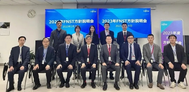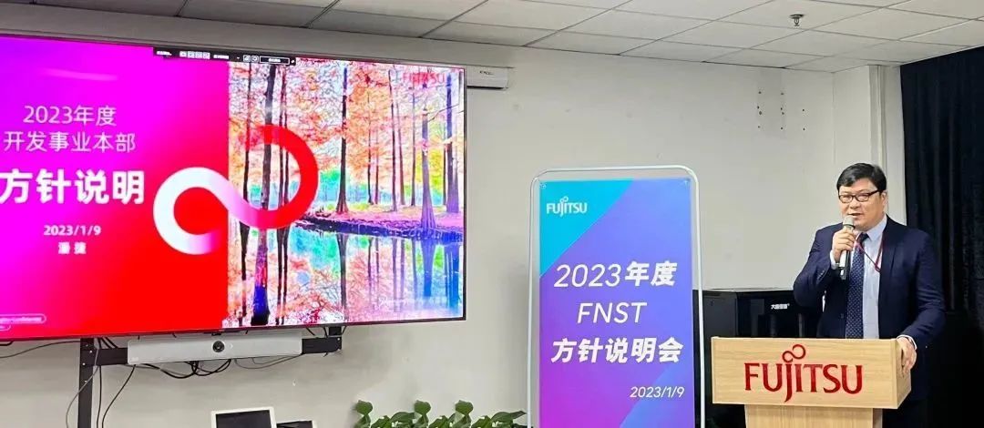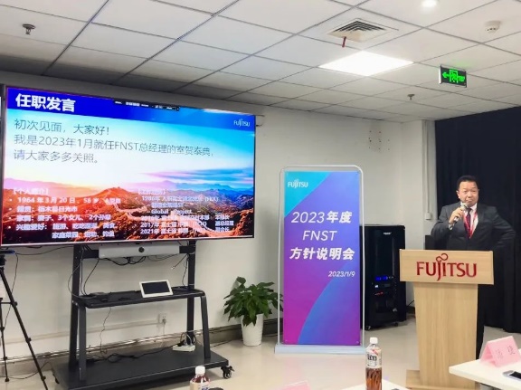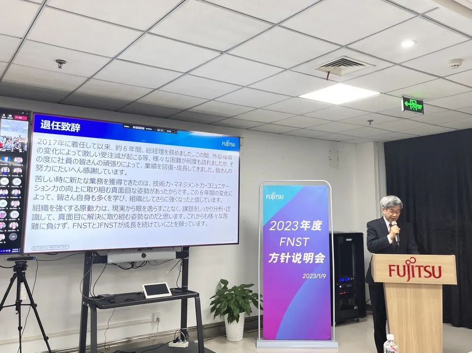 接下来,新任总经理室贺泰典先生说明了2023年度的事业方针。他先介绍了新的经营体制和组织体制,并公布了2023年度业务目标、经营方针及具体举措,特别明确了要从强化业务(技术)、客户起点(产品)、人才培育(服务)这3个方面努力实现FNST、JFNST的持续稳健发展。他强调,期望FNST全体员工在今后的工作中,能够继续严格执行并遵守由企业目标、核心价值观、行为规范三部分构成的Fujitsu Way。