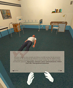 Mithilfe der VR-Technologie beziehungsweise entsprechender Animationen können fortan reale Abläufe und Notsituationen simuliert werden. Die Auszubildenden tragen dabei ein mobiles All-in-One VR-Headset. Die VR-Brille stellt nicht nur die Übungssituation dar, sondern – durch zwei integrierte Controller – auch die Hände des Anwenders, sodass dieser in einer lebensnahen Illusion agiert. So können Nutzer zum Beispiel den Rhythmus bei Herz-Druckmassagen authentisch üben.