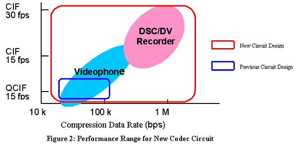 Results from the test chip show that the codec circuit can operate on as little as 9 mW, the lowest power requirements yet achieved in the industry, when used to simultaneously compress and decompress the QCIF-sized (176 x 144 pixel), 15 frames-per-second signal needed for a wireless videophone. This design can both generate and play back higher-quality video streams up to CIF size (352 x 288 pixel) at 30 fps, or 2 Mbits per second (see Figure 2).
