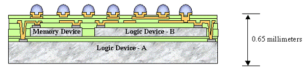 Figure 1 shows a CS Module for high-end applications. This places a second logic device on top of the first, plus a memory device (the prototype includes four chips). The upper-stage chip spacing is at a 0.040 mm pitch. Employing 0.050 mm thick chips, the module achieves a maximum density of only 0.65 mm.