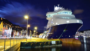 Kuvalähde: Wärtsilän kuvapankki: MS Energy Insula in port at night. The vessel has been designed by Wärtsilä and has the VS 485 MKIII design.