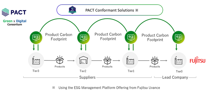 Pour atteindre ces objectifs de décarbonisation, depuis l’exercice fiscal 2024, Fujitsu a renforcé sa collaboration avec ces acteurs, en mettant en œuvre l’échange de données entre les entreprises qui utilisent l'empreinte carbone des produits (PCF) à partir de données réelles pour visualiser et réduire les émissions de CO2 liées aux pièces et matériaux achetés.
