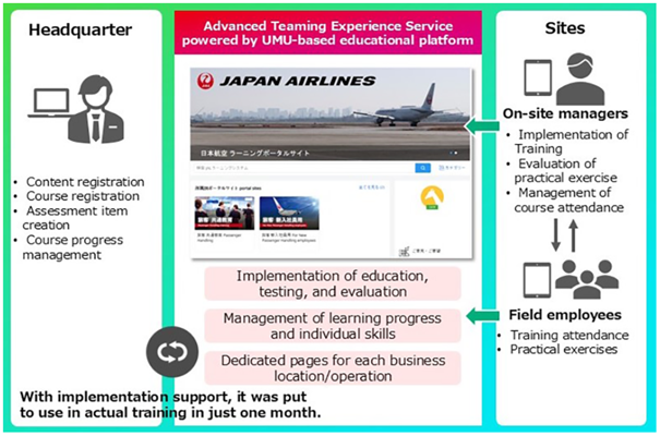 Pour relever ces défis, Fujitsu a collaboré avec JAL afin d'analyser les problèmes et de concevoir le cadre opérationnel de la plateforme d'apprentissage numérique. Grâce à l'expertise acquise par Fujitsu dans la mise en œuvre et l'exploitation de plateformes de formation à grande échelle, notamment celles destinées aux institutions financières utilisant le service Advanced Teaming Experience Service optimisé par UMU, le processus de déploiement, qui prend généralement environ trois mois, a été achevé en un mois environ.