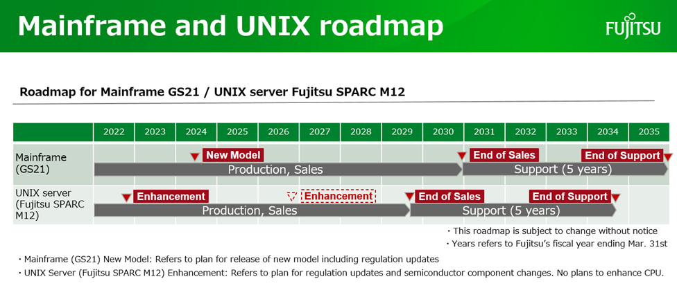 To support customers and partners on this journey, Fujitsu has created a new roadmap that includes a timetable for shifting its mainframes and UNIX servers to the cloud, gradually enhancing its existing business systems to optimize the experience for its end-users. To promote the modernization of its customers’ systems and ensure sufficient time and consideration for this transition, Fujitsu has indicated that it will discontinue sales of mainframes in fiscal 2030, concluding support services in fiscal 2035. Additionally, the roadmap plans for the discontinuation of sales of UNIX servers in fiscal 2029, and the end of related support services in fiscal 2034.