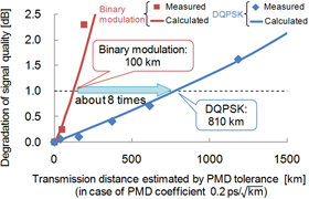A modulation method for digital signals whereby 2 bits of data are allocated to each of four modulated optical phases. The use of four types of optical phases enables a pulse width that is double that of the binary modulation scheme, reducing the effect of waveform distortion due to PMD.