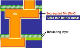 By forming copper with manganese additives on an ultra-thin film barrier metal, Fujitsu succeeded in reducing interconnect line resistance, while maintaining high reliability. This interconnect structure (see Figure 1) is formed through the following processes: