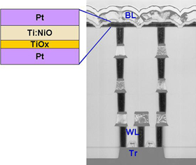 Conventionally, ReRAM devices have been formed from nickel oxide (NiO) films. In Fujitsu Labs' new ReRAM, a NiO film doped with titanium (Ti:NiO) was developed, and its performance was evaluated in combination with a transistor (see Figure 1).