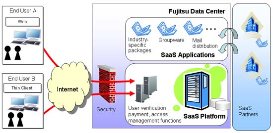 To meet these customer needs, Fujitsu will offer a set of SaaS services, consisting of its FENICS II network services, IT hardware and software platforms, applications, and utility services, such as user verification and payment systems, as well as combinations of services in tailored outsourcing proposals.