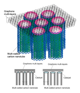 In order to better understand the growth mechanism of carbon nanotubes, Fujitsu Laboratories conducted experiments using chemical vapor deposition, a technique in which a feedstock gas is heat-cracked in a vacuum chamber to synthesize film or structures on a substrate. This resulted in the formation and discovery of aligned growth(5)multi-walled carbon nanotubes(6) featuring layers of graphene (from a few layers to a few dozen) on top formed in a self-organizing way, thereby forming a complex composite (see Figure 1).