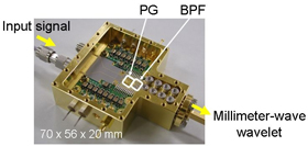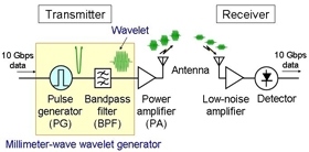 Transmitting in the 70 - 100 GHz band, however, has involved multiple single-purpose electronic components, with little progress on miniaturization. This sparked interest in the development of impulse-radio technology, which needs no oscillator, and the transmitter (millimeter-ban pulse transmitter) can be constructed using only two components: an impulse emitter and an amplifier (see Figure 1). However, 70 - 100 GHz wireless communications required breakthroughs in generating high-energy pulse signals and the development of filters with low energy losses.