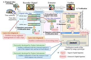 In addition to applications in the surveillance market for storage, archiving, and utilization of video, Fujitsu Laboratories is also targeting applications in the video verification/tracing business, such as enabling detection and tracing of tampered portions of video.