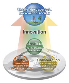 To support the creation of a prosperous, low-carbon society, the Fujitsu Group will leverage its technologies and know-how to inspire environmental innovation for its business and for society, in collaboration with customers and partners.