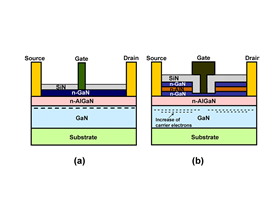 Figure 1: Structure of a GaN HEMT(a) Conventional structure(b) Structure of newly-developed HEMT from Fujitsu