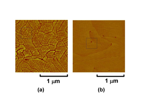 Figure 2: Image of atomic-scale surface roughness on GaN HEMT(a) 2-layer cap structure without uppermost layer(b) 3-layer cap structure newly developed by Fujitsu