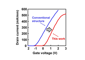 - The design of the gate electrode, which was formed after removing the AlN layer, decreases the density of carrier electrons around the region below the gate electrode, preventing current from flowing even in the absence of a negative voltage.