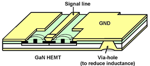 - Although wires used in ground connections reduce the amplification factor of high-frequency signals used in the C- to X-band range, in the newly-developed hybrid circuit a transistor with via holes that connect the GaN HEMT chip's surface electrode with the bottom electrode (Figure 1) is used, thus eliminating the need for ground connection wires and thereby suppressing reduction of the amplification factor of high-frequency signals.