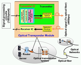Optical transmitters require an IC that outputs a high-speed electrical signal of 40Gbps, by multiplexing together multiple electrical signals, each running at a relatively slow speed of 2.5Gbps to 10Gbps. Currently, transmitter ICs employ CMOS process technology for the low-speed interface circuitry and internal control circuitry, but require high-power compound semiconductors(5) for high-speed signal generator circuits that generate 40Gbps-electrical signals (Figure 1). If CMOS technology - which in accordance with miniaturization has become capable of high-speed operation - could be used for the signal-generating circuit, and if all required transmitter functions could be integrated onto a single chip by employing CMOS technology, optical transmission equipment that is power-efficient, compact, and low-cost can be realized.