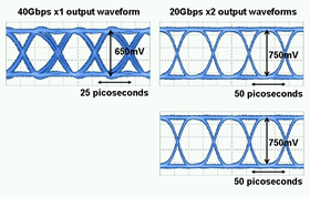 This transmitter IC is the first ever to use the SFI5.2(8) interface, which has emerged as a standard in recent years for low-speed interfaces. By taking advantage of high-integration capabilities available in CMOS technology, the transmitter IC also has ability to output two 20Gbps signals in order to support a signal modulation technique intended for long-distance transmissions (Figure 3). This CMOS-based transmitter IC makes it possible for multiple systems to be handled by single chip, which is anticipated to lead to widespread availability of 40Gbps optical transmission equipment.