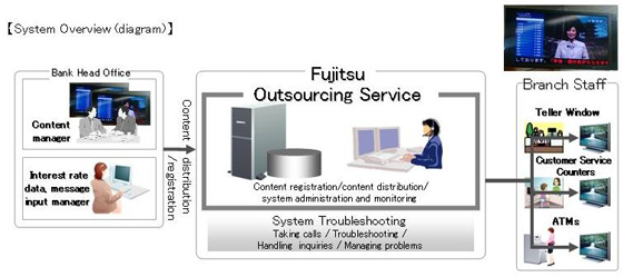 - Minimizes the resources needed to manage and operate information distribution due to Fujitsu's outsourcing service, which manages the simultaneous distribution of content to a maximum of 1,400 large screen displays installed throughout the branch network