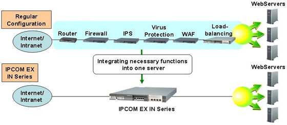 By incorporating the new WAF security feature responsive to the latest threats affecting web security holes, with the IPCOM EX series of network servers bringing together firewall and load-balancing functions into one, customers can build a safe and secure web system fast and simply. This enhancement allows customers to minimize installation and operating costs, as well as the use of space and cables, and reduce power consumption.