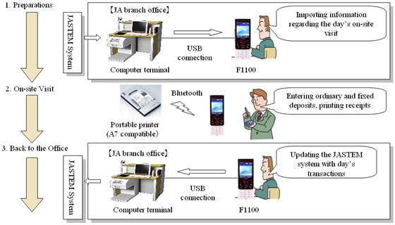 Using the JASTEM terminals installed at each JA office branch, field service representatives can import information required for the day's scheduled visits to the smartphone. While on-site with a customer, they can input transactions into the smartphone and print receipts using the accompanying portable printer, as well as perform financial simulations to calculate interest rates and loan return figures. After returning to the office, field service representatives update the JASTEM system through the smartphone.