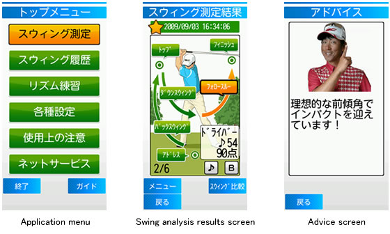 Using the mobile phone's built-in sensors, the application gathers motion data, which is then fed into a 3D motion sensing engine to analyze and assess the path of the user's golf swing and provide advice based on professional golfer Mr. Tadashi Ezure's golf principles. It also allows users to compare each swing against their past best recorded swings, making it a full-featured swing-diagnosis program. In addition, the application can connect to a number of related online mobile services, including a variety of services planned with Golf Digest Online Inc.