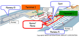 Management of aircraft on the ground (moving between spots and runways) at Japanese airports is generally handled using the national air-traffic control radio system. However, at the country's only domestic apron area at Narita International Airport, in lieu of using national air-traffic control, aircraft movement is handled by the Ramp Controller, an NAA staff member communicating by aircraft radio to maintain the safety and efficiency of airport operations.