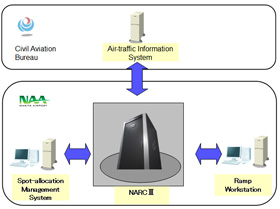 NARC also connects to two indispensable subsystems used in managing aircrafts at the airport: the "ramp workstation," which assists with the movement of aircrafts on the apron(4) surrounding the terminal and the "spot allocation management system" which manages spots where aircraft park. Information is shared between these subsystems to support apron operations in general.