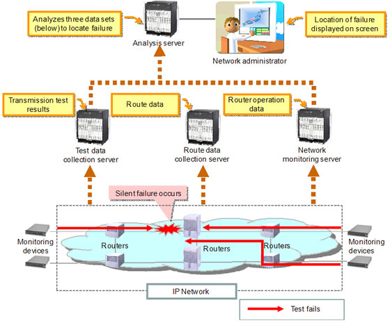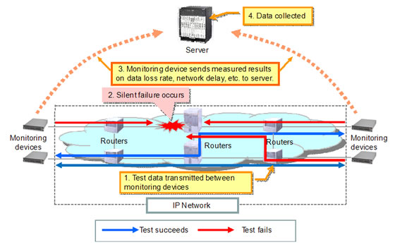 One of the two new technologies analyzes data on not only test transmissions but also loss rates and network delays, which facilitates faster detection of silent failures. It can also detect warning signs of silent failures that are possibly about to occur.