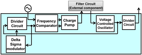 In Japan, the popularity of "1seg" broadcasts viewed via mobile phones has led to needs for terrestrial digital TV broadcast tuners that are compact and which can operate on low power. In addition, there is also growing anticipation for mobile phones equipped with dual-tuners, which will enable simultaneous recording of multiple TV programs and quicker channel scanning. Synthesizers, a major component in these tuners, have typically used delta-sigma modulation in a fractional multiples method. However, this conventional method has required an external filter circuit to suppress the noise that can impair the tuner's reception sensitivity — the need for such external filters is an obstacle to miniaturizing the module. Furthermore, with the conventional delta-sigma modulation/fractional multiples method (Figure 2), in order to create a dual-tuner, two (2) external filters are required, thus further increasing the size of the module.