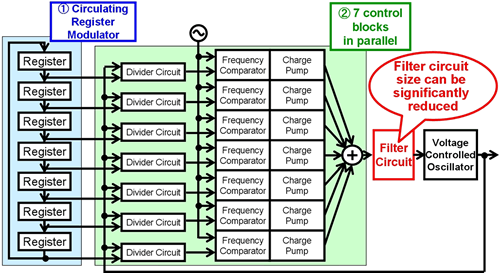 The new "circulating registers" modulator from Fujitsu Laboratories features an innovative circuit design in which seven (7) registers are lined up in parallel, resulting in accurate reception of 3/7th MHz frequency intervals that are used in terrestrial digital TV broadcasts in Japan, which makes possible an efficient 1/7th MHz multiplier needed for terrestrial digital TV broadcasts in Japan. These factors enable noise suppression, thus eliminating the need for an external filter circuit and resulting in a more compact frequency-synthesizer. (Figure 4)