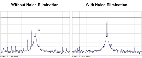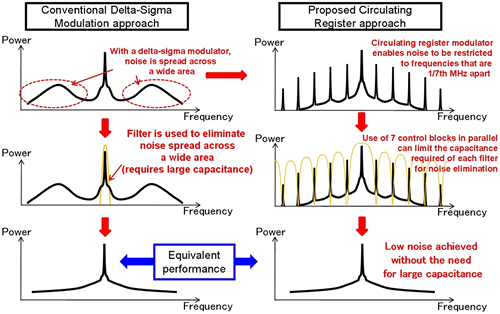 Figure 4. Conventional vs. new noise elimination methods(Conventional: delta-sigma modulator. New: "circulating registers" modulator.)