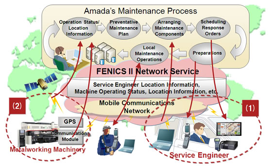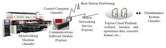 Since July 2009, Fujitsu and Amada have jointly explored ways of remotely collecting and accessing, via mobile networks, information on the location and operational status of Amada's machinery. Using such mobile technologies as Fujitsu's FENICS II networking service, mobile phones, and wireless networks as a foundation, this was realized by embedding a communications module in Amada's control computers linked to its metalworking machinery. The two companies began joint experimental trials in November 2009, paving the way for the development of a remote monitoring system through the progress involving the configuration of applied ICT systems, data collection cycle of the machinery, response speeds, as well as costs.