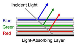 The new feature-enhanced color e-paper developed by Fujitsu Laboratories and to be commercialized by Fujitsu Frontech employs a layered construction found in cholesteric liquid-crystal display (LCD) panels with an image memory function, and makes use of the reflective properties in each color layer where the cholesteric liquid crystals reflect a specific wavelength of light of red, green, or blue (Figure 2). Compared to the reflective displays using a color-filter array widely used in conventional LCDs, Fujitsu's cholesteric LCD method allows for a display that features colors with greater vibrancy and brightness.