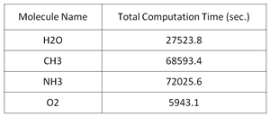 During the actual computation, the matrix for the largest molecule employed in this study - ammonia (NH3) - reached a size of 19,640 × 19,640, and therefore had too many elements to be processed in a practical amount of time using average computer systems (Figure 3). By employing a supercomputer, the team was successfully able to solve the matrix in the computing time shown in Figure 4. For this computation, the T2K Open Supercomputer employed 128 nodes for its computations, utilizing a total memory volume of 4 terabytes and 2048 cores.