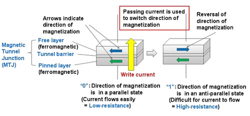 Spin-torque-transfer MRAM is expected to become a successor to flash memory not only because of its compact size, but also because of its potential for low power consumption and high performance. This has spurred R&D aimed at practical implementation of spin-torque-transfer MRAM.