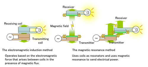 By contrast, the magnetic resonance method, which was first proposed in 2006, uses a coil and capacitor(1) as a resonator, transmitting electricity through the magnetic resonance between the power transmitter and power receiver. This method can transmit electricity over a range of up to several meters, and because a single transmitter can power multiple receiving devices, developments are under way for a broad range of potential applications, charging everything from portable electronics to electric cars.