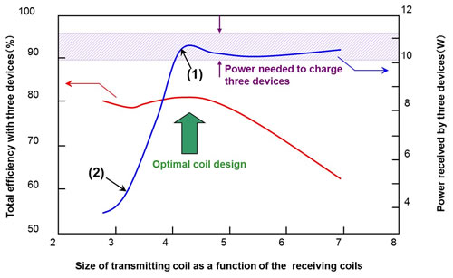 Figure 3 shows how charging performance varies with changes in the size of the transmitter's coil in an analysis of the simultaneous charging of multiple devices, where a single transmitter was transmitting to three receivers. This analysis, which found the optimal coil size for efficiently charging three devices, took roughly 10 minutes, or 1/150th the time it had taken before. Even with multiple transmitters and receivers, the design time is dramatically reduced.