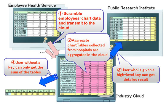In addition, with confidential numerical chart data, such as a breakdown by region of patients suffering from a certain disease, special operations can be performed on the data to mask the original figures before sending the data to the cloud, making it possible for multiple data sets to be aggregated without any modifications (patent pending). Each user can obtain access to different levels of detail for the tallied results using decryption keys that grant different levels of access (prefecture level, city level, town level, etc.). Processing is possible without needing to store actual data or keys in the cloud, and, in addition, the data can be accessed by users on multiple levels based on a single data set, making database management easy.