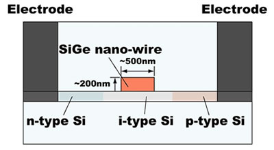 Fujitsu has developed the world's first optical switching element that uses fine-patterned SiGe in the refractive-index modulator (Figure 4). Forming fine-patterned SiGe, which has a narrower band-gap than Si, on top of Si allows for more efficient electron accumulation, and therefore less power is required for switching.