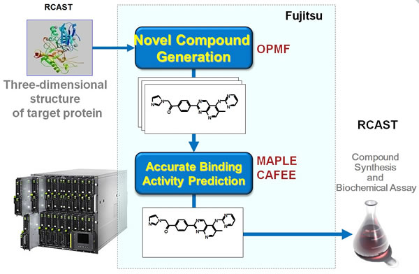 The current research collaboration is focused on designing small molecule compounds. It will use RCAST's research on proteins believed to be the underlying cause of specific disease indications, and combine it with Fujitsu's OPMF(3) small molecule design software, which enables drug-efficacy prediction and screening with a degree of precision equivalent to actual clinical trials, and the company's MAPLE CAFEE(4) accurate binding activity prediction software to perform simulations run on the supercomputer developed by Fujitsu. The computer-designed compounds designed will then be evaluated by RCAST through a series of biochemical assays (figure 2).