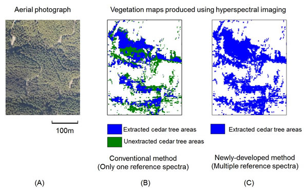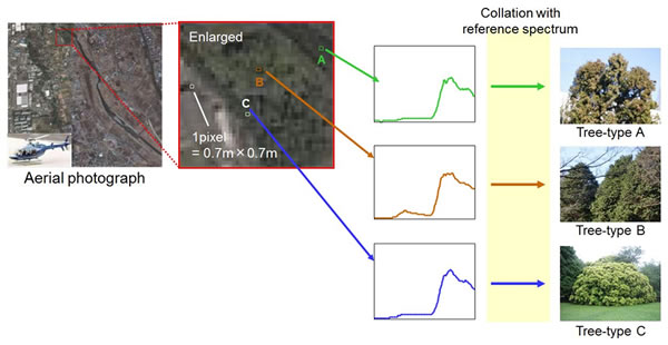 Under conventional methods for distinguishing trees (see figure 1), aerial images taken at a height of approximately 500-2,000 meters by a hyperspectral camera-equipped helicopter or other aircraft are used to measure the wavelength range of the near-infrared reflectance spectrum from the emitted light. The species of trees appearing in the image can be identified by comparing that data with a predetermined reference spectrum for each species of tree. However, as the spectral images of the trees capture not just sunlight but also the reflected light from individual leaves and trees in a forest, resulting in mixed light emission readings, the reflectance spectrum pattern from the same species of tree may differ depending on the location of individual trees. This made it impossible to precisely distinguish trees by using only one reference spectrum for each species.