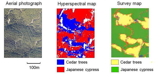 The field test verified the effectiveness of the newly developed technology in distinguishing among such highly similar trees as the cedar tree and the Japanese cypress, which had been problematic using conventional remote survey methods.