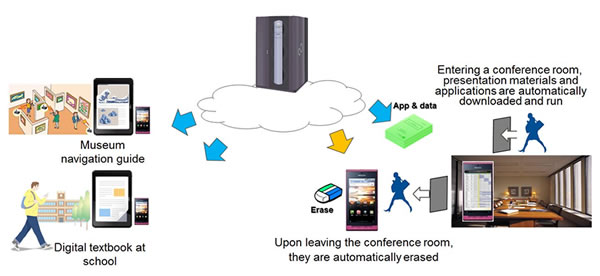 This new technology will enable users to simply carry their information device into a conference room, for instance, and download needed applications and data for immediate access to the meeting's presentation materials. This reduces the time required to setup applications and transfer data, making it possible to significantly improve users' operational efficiency.