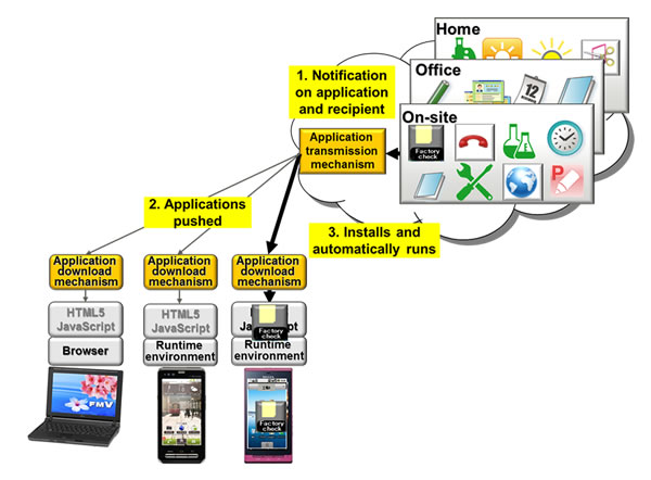 Fujitsu Laboratories has developed a communications platform and application runtime environment that automatically conducts the sequential activities of: 1) Determining a user's circumstances by using GPS and other sensor data; 2) delivering the necessary applications and data from the cloud, depending on the situation; and 3) launching and running the applications on the device. On smartphones, the management and transmission of applications and data is handled via dedicated software, and in the case of a PC, a proprietary chip is employed, even during sleep mode, to restore the PC and perform the communications.