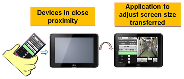 Fujitsu Laboratories has developed technology that enables applications to be transmitted to other devices, and even between differing device types such as smartphones and PCs. By leveraging Near Field Communication(1) and various information, devices can transmit applications and data to other devices as they near in proximity. Applications can then be executed and adjusted to fit different sized screen displays for an easy-to-view layout.