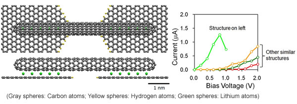 Graphene and carbon nanotubes feature extremely high electron mobility. With their development, the combination of graphene electrodes and carbon nanotubes has become a leading candidate for new all-carbon devices. Among the models studied using the newly developed technology, only the electrical properties of the model found in Figure 3 possess the ohmic properties(6) desirable for use in devices. It was also discovered that the electrical properties of a model vary significantly depending on the length of the nanotubes and contact structure. These results would have been impossible using conventional empirical methods and first-principles calculations with a limited number of atoms.
