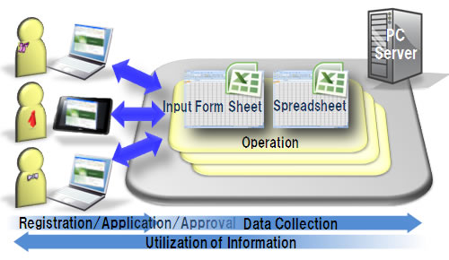 RapidWebSS employs the same familiar Excel format, which is already used in many offices, to produce new documents including administrative tables, request forms, reports, and application forms. As a result, web applications can be easily generated. Once a web application has been created, the software can also flexibly accommodate necessary specification changes. Users of web applications produced using this software can access the applications over the Internet from their own computers to input or browse information.